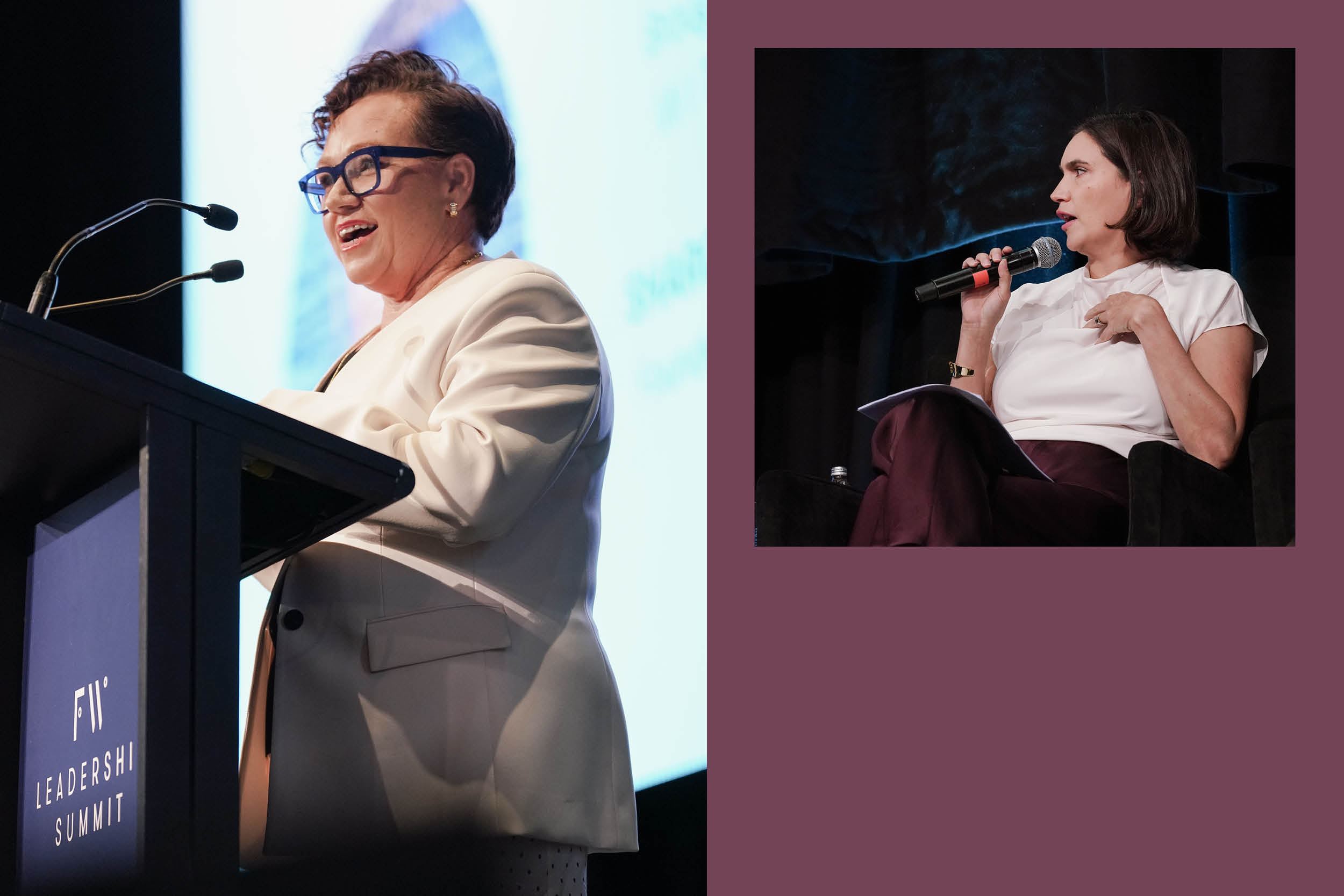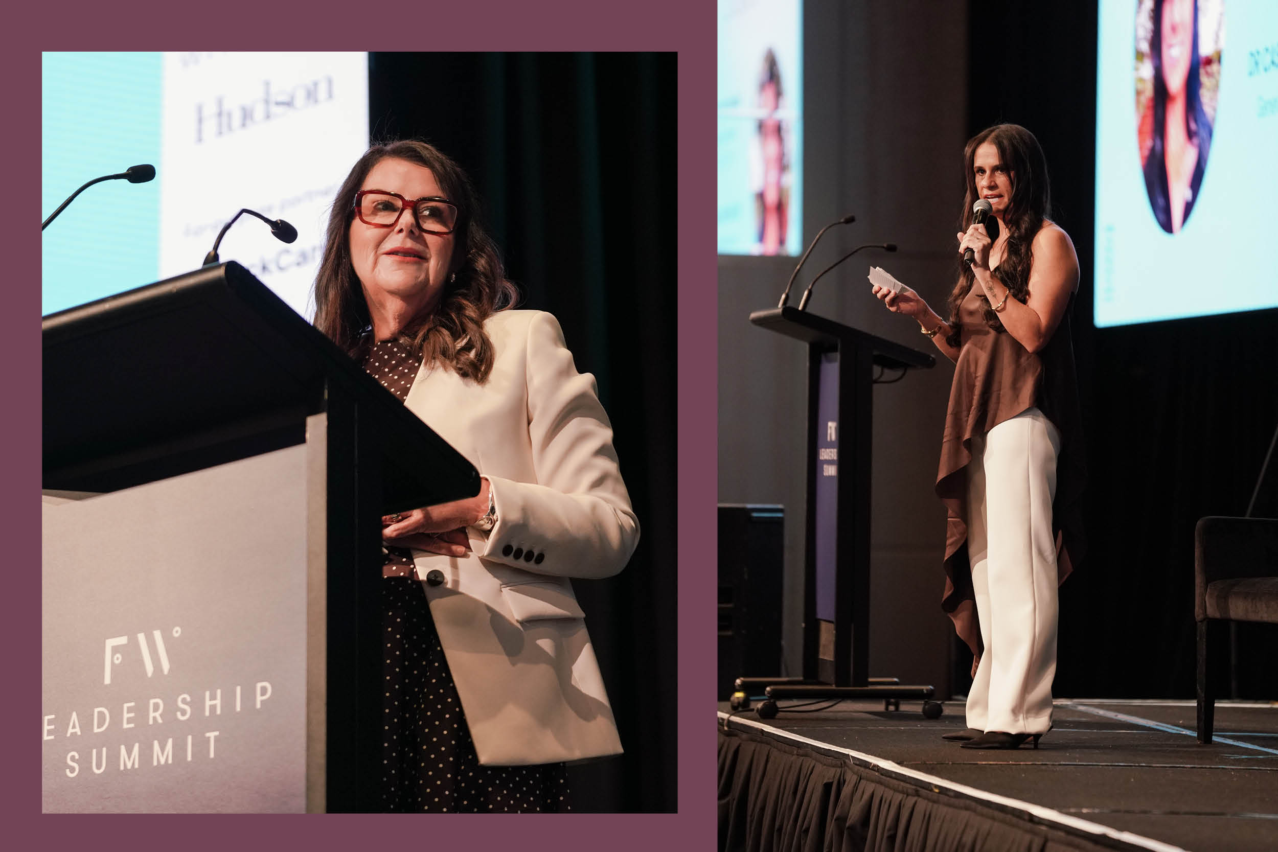 Sharon Winsor on-stage at the FW Leadership Summit, Emily Hill introduces the Leading Through Change session
