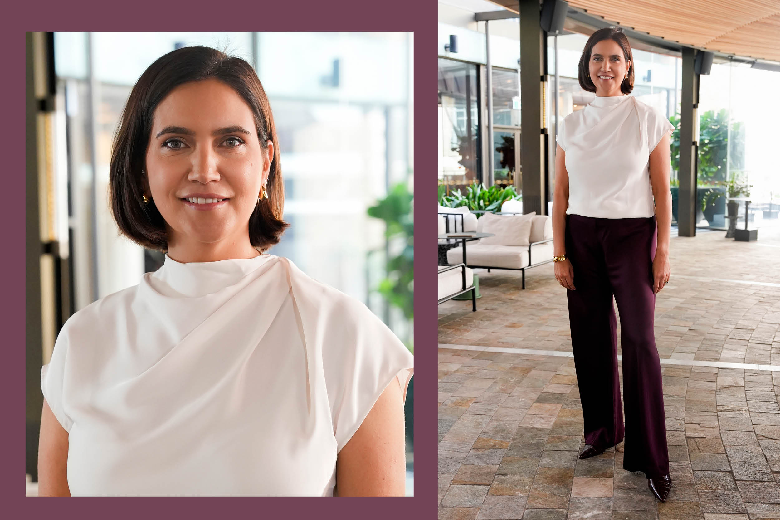 Emily is wearing Vanilla tuck Shoulder top, Plum bias cut pants, Bitter Chocolate Fleur textured heels, Gold Talia cuff and Gold Kai Molten Drop earrings.