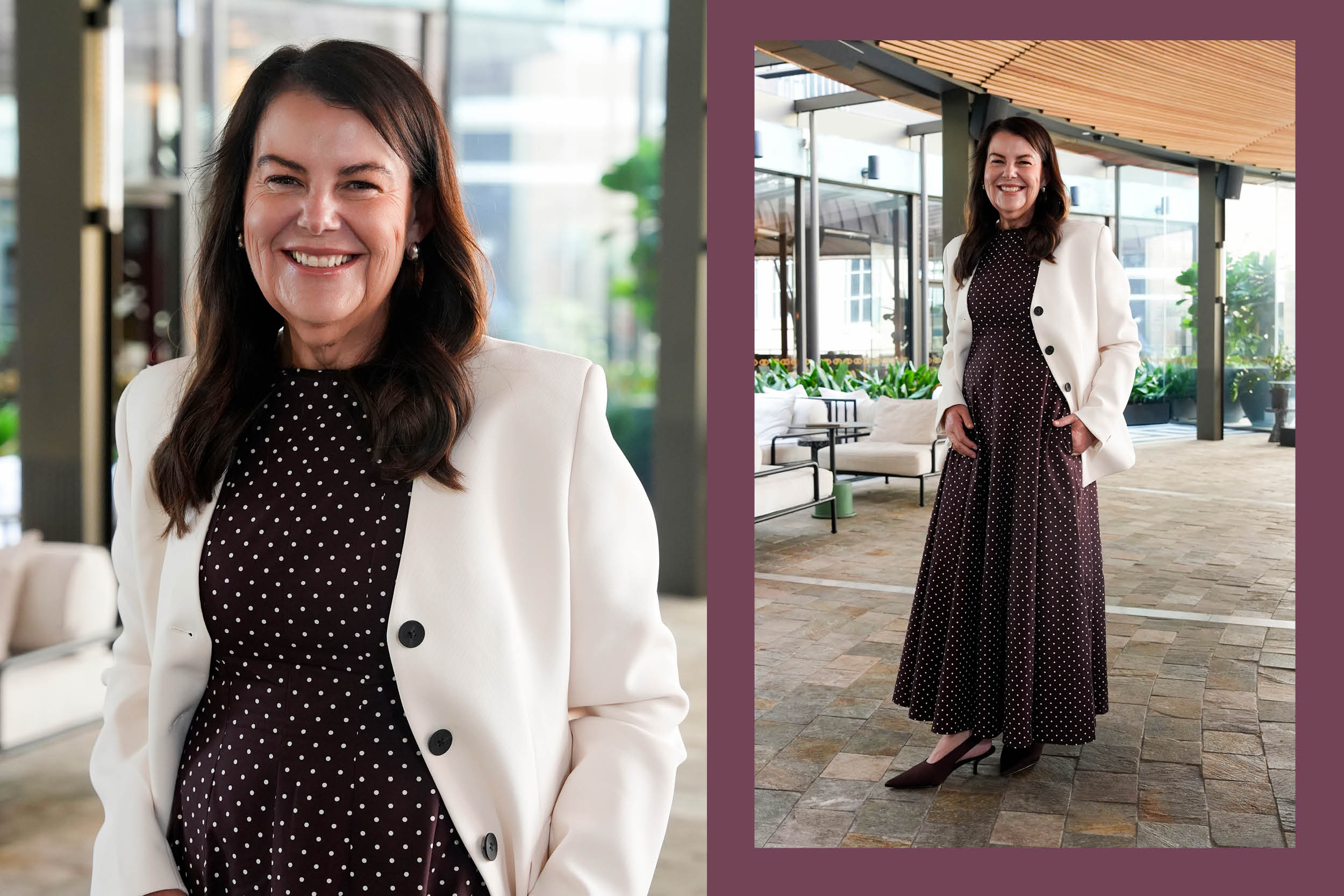 Rachelle is wearing Plum polka dot dress, Vanilla collarless blazer, Bitter Chocolate Fleur heels, Silver Stella ring and Silver Stella earrings set.